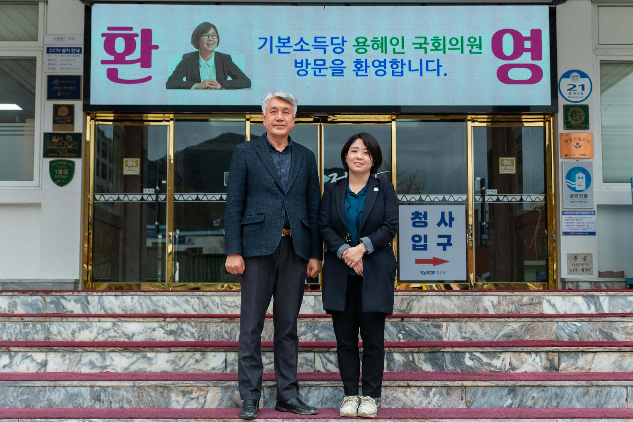 ▲ 정선군청 앞에서 포즈를 취하고 있는 최승준 정선군수(왼쪽)과 용혜인 국회의원(오른쪽) 가로 사진