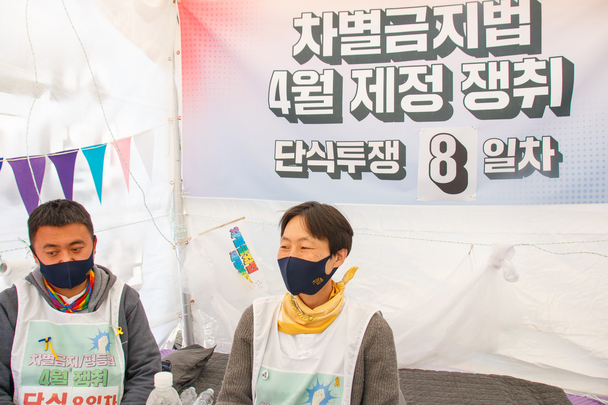 ▲단식 중인 이종걸, 미류 대표의 모습. 두 사람의 뒤로 차별금지법 4월 제정 쟁취 단식 농성 8일차라는 현수막이 붙어있다.
