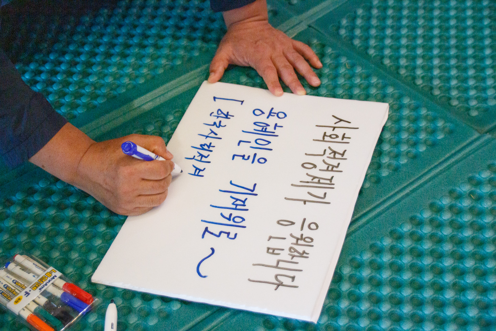 ▲ 지지 메시지를 남기고 있는 사회적경제연대회의, 피켓에는 "사회적경제가 응원합니다. 용혜인을 기재위로~"라고 쓰여있다.