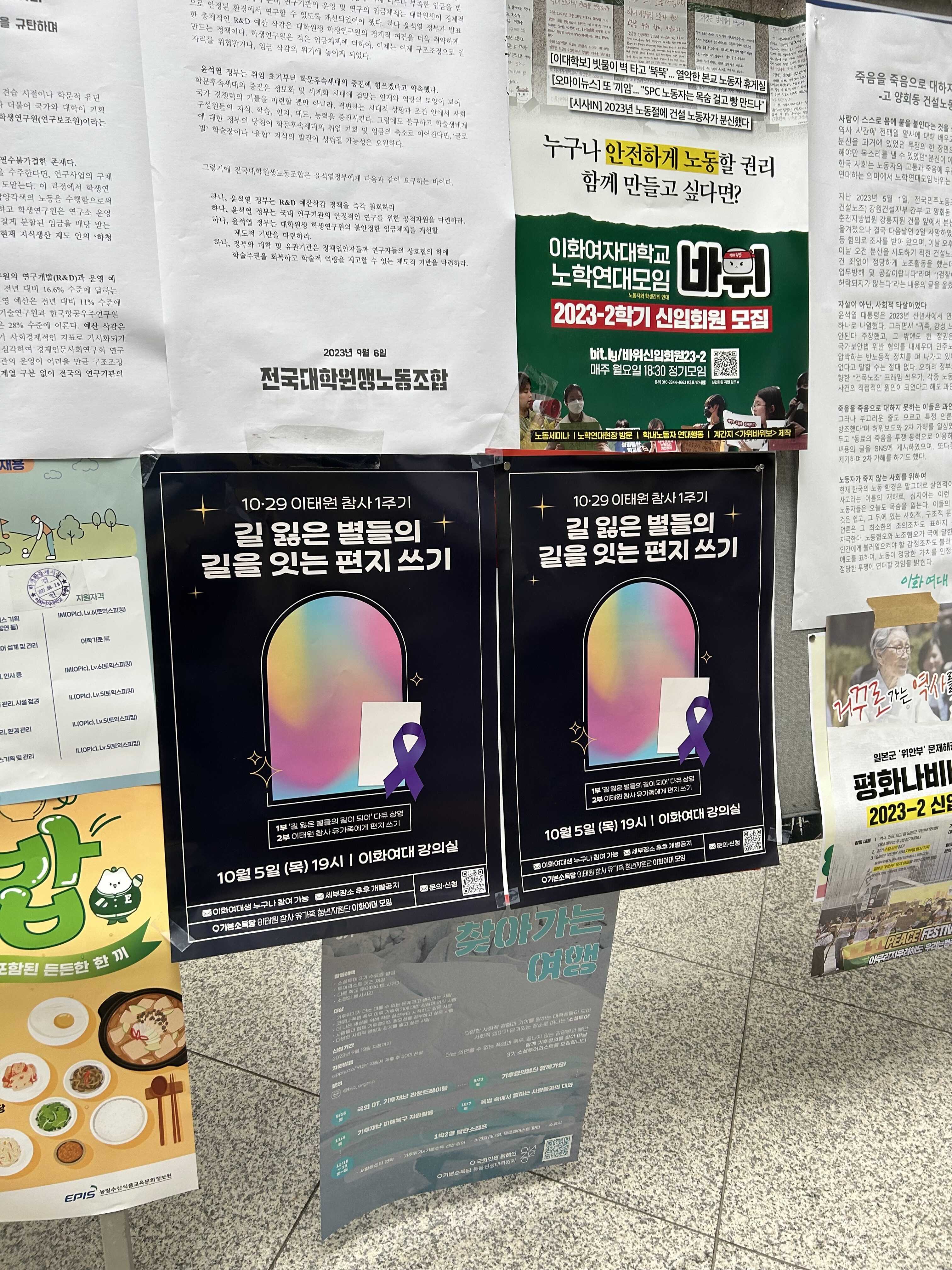 10·29 이태원 참사 1주기 길 잃은 별들의 길을 잇는 편지 쓰기, 대학별 편지쓰기의 첫 순서는 이화여자대학교였습니다.