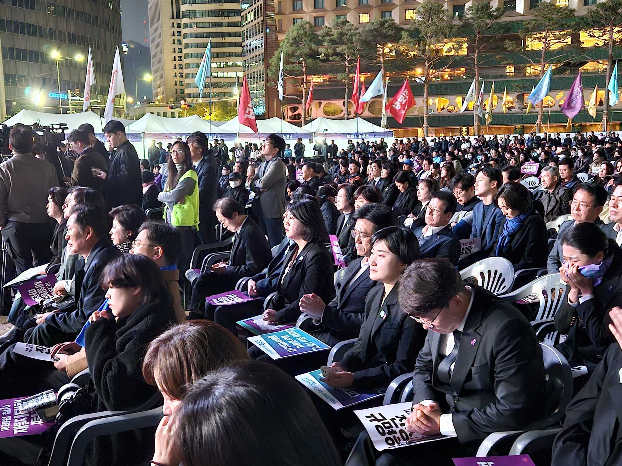 "오늘까지도, 윤석열 대통령은 대한민국의 대통령이 마땅히 앉았어야할 바로 그 자리에 앉지 않았습니다. 그럼에도 우리는, 우리 국민들은 믿음이 무너져 내린 자리에서, 꿋꿋이 서로를 믿고, 진실을 갈망하며, 실낱같은 희망의 끈을 부여잡고 나아가고 있습니다.