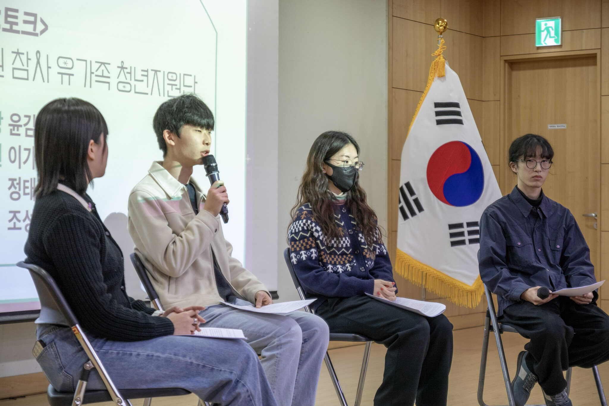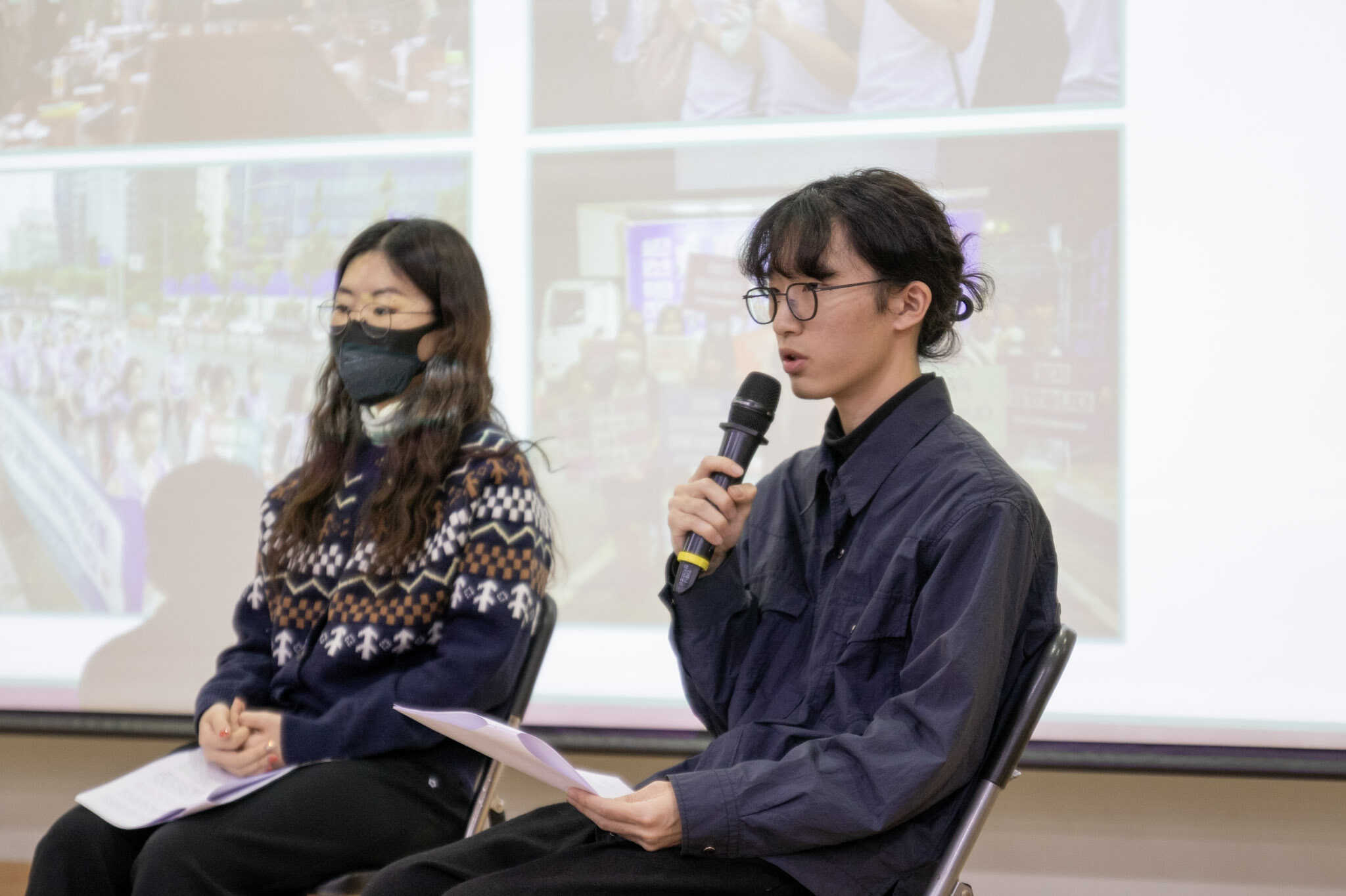 상영을 마치고는 청년지원단원들과의 2부 토크가 진행되었습니다. 청년지원단에서 지난 하반기를 함께 보낸 4명의 단원이 무대로 나와 영화를 본 소감과 지난 연대활동 중 기억에 남았던 일, 관객들에게 전하고 싶은 말을 나누었습니다. 단원들은 각자의 학교에서 유가족 간담회와 편지쓰기 행사 등을 준비하며 맞닥뜨렸던 혐오표현에 놀라고 두려울 때도 있었지만, "혐오보다 연대의 힘이 더 세다"는 것을 온몸으로 깨닫는 경험이었음을 전했습니다.
