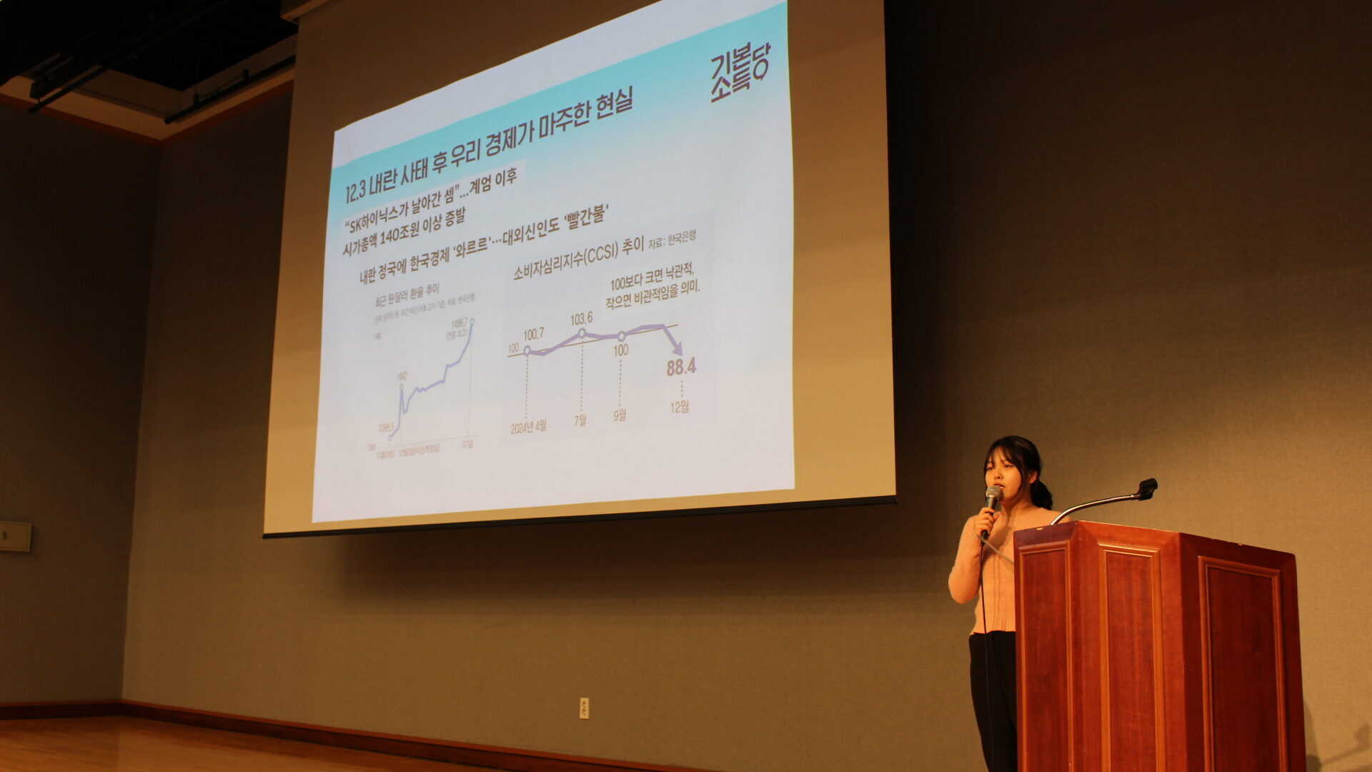 민생경제 분야 발제는 기본소득당 안산시위원회 홍순영 부위원장이 진행했습니다. 홍순영 부위원장은 민생파탄의 주범 윤석열을 조속히 탄핵시키고, 기본소득이 있는 대한민국, 보편적 사회서비스가 보장되는 대한민국을 나아가자는 제안을 했습니다.