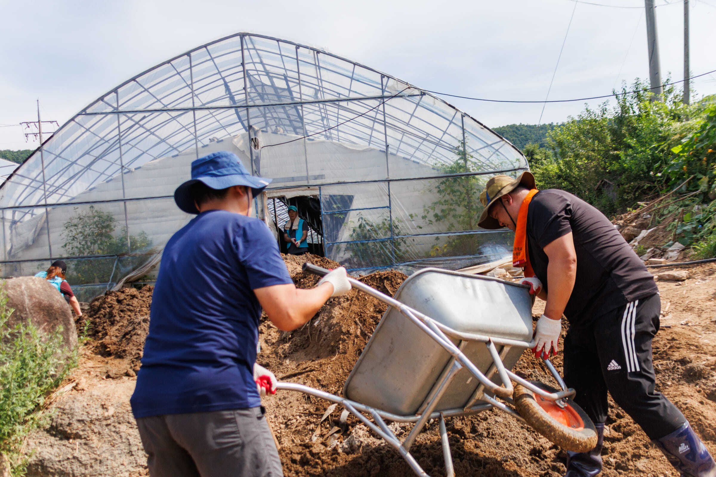 당원들과 함께 찾은 곳은 가평군 상면에 있는 다슬기 양식장이었습니다. 차양막 쳐진 비닐하우스 양식장 안이 수해로 휩쓸려온 흙과 나뭇가지 등으로 망가져 있었습니다. 비닐하우스 안에 있는 토사를 빼내야 해서, 사람 손이 참 귀한 작업이었습니다.