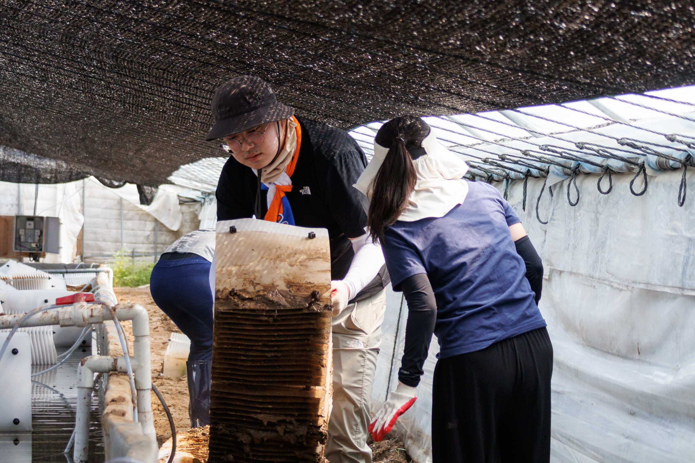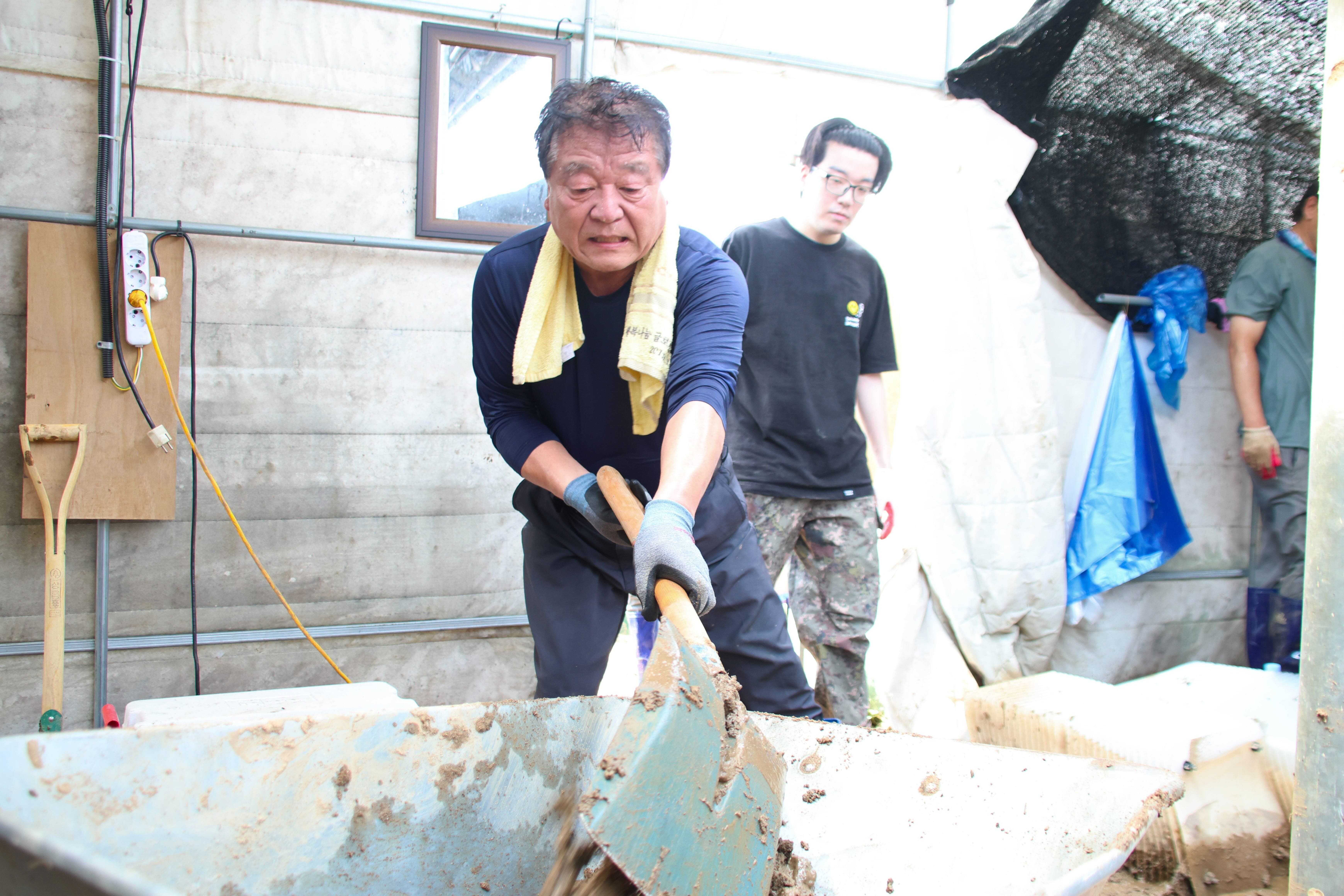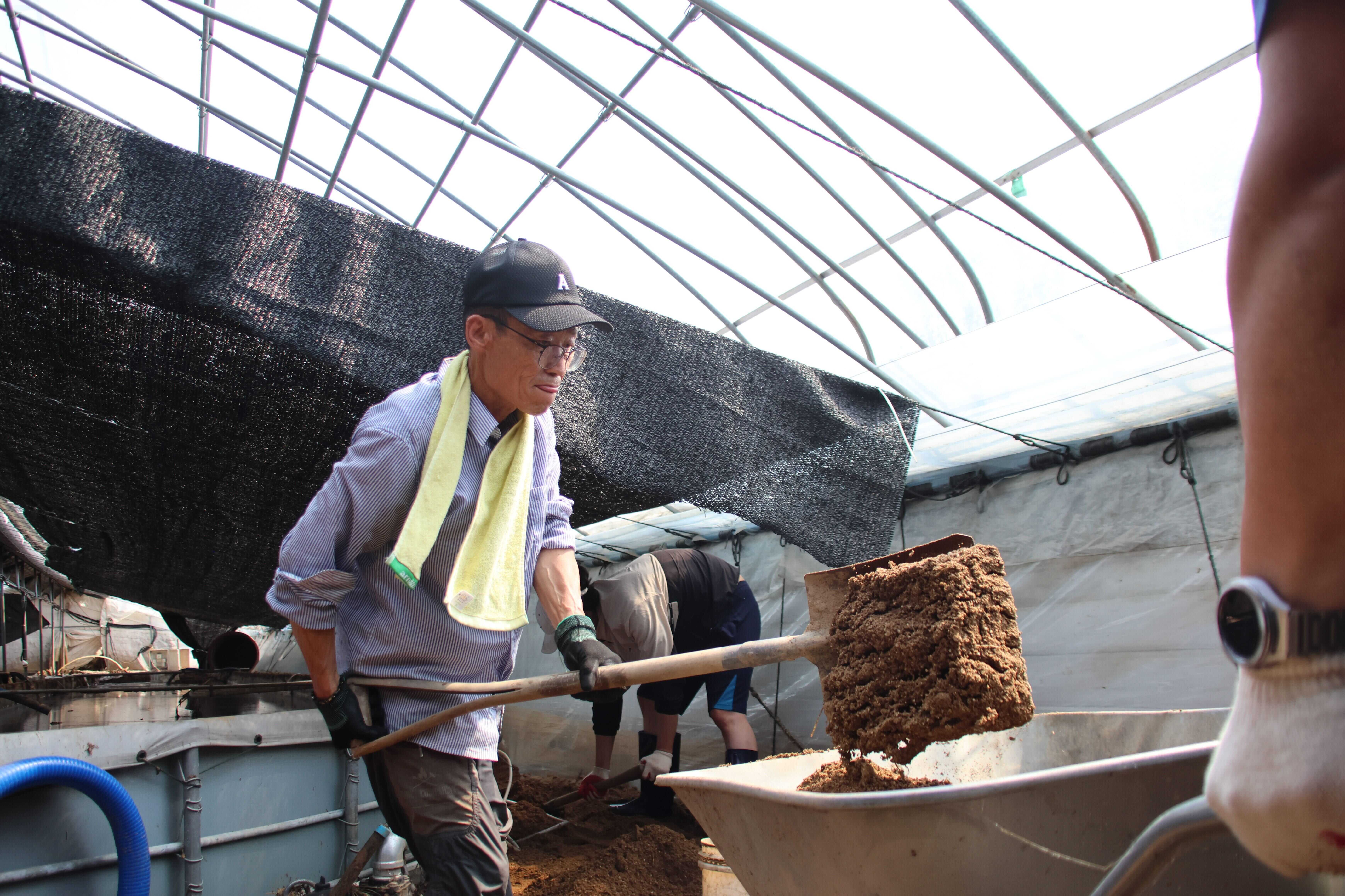 삽으로 토사를 떠서 통이나 수레에 실어 나중에 포클레인이 한꺼번에 토사를 퍼갈 수 있는 장소로 옮기는 작업을 했습니다. 또, 용혜인 대표를 비롯해 저희처럼 수해피해 복구에 손 보태기 위해 오셨던 시민 몇분은 진흙으로 뒤덮여 쓸 수 없는 상태가 된 다슬기 키우는 것을 물로 씻어내는 작업도 했습니다.