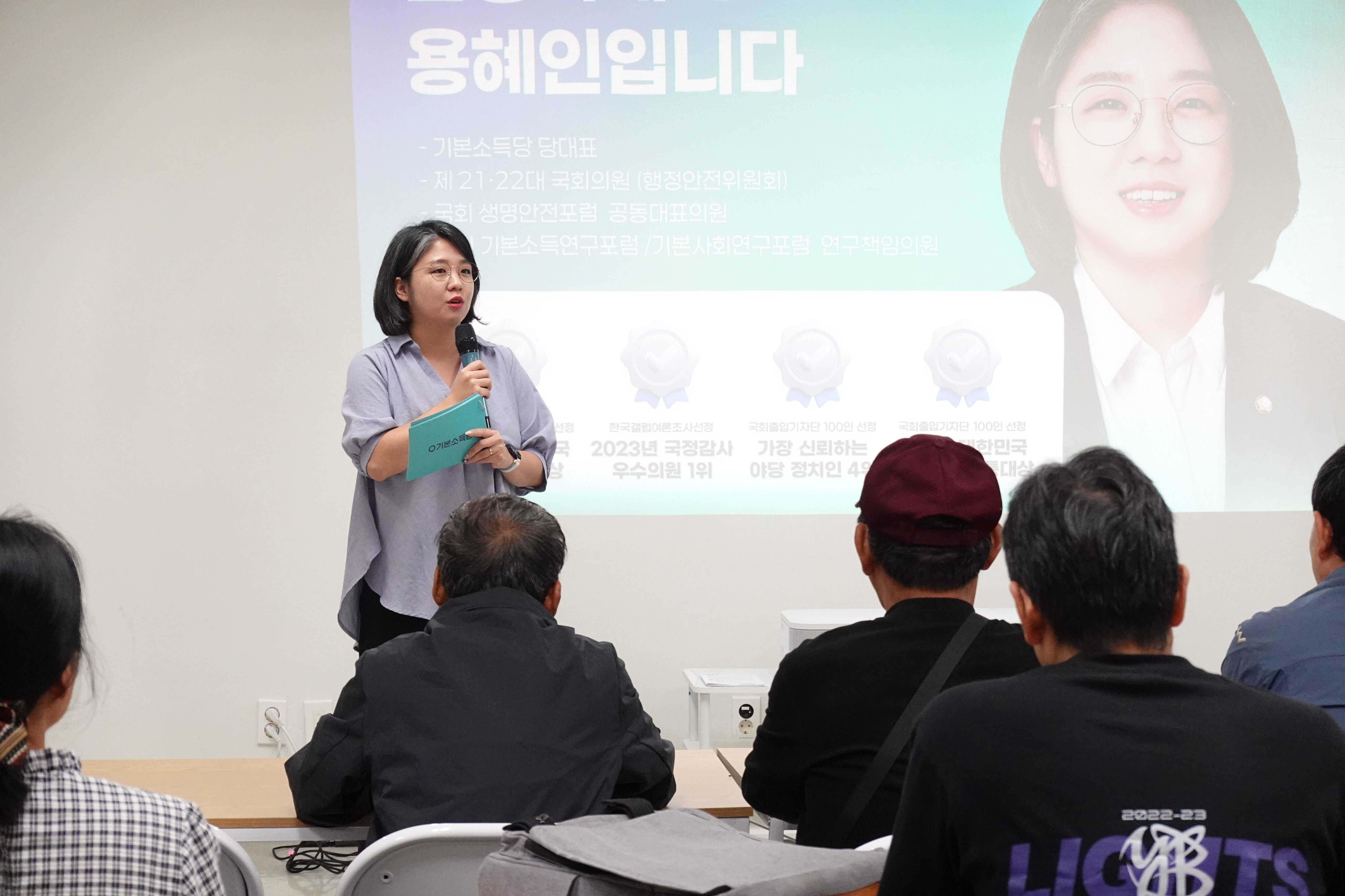 새정부에서 기본소득의 비전을 어떻게 현실화할 수 있을지, 에너지전환과 디지털전환의 경로는 무엇인지 용혜인 대표님의 강연을 통해 전달드린 뒤 아동기본소득을 주제로 토크콘서트를 진행했습니다. 아동·청소년을 양육하는 주민 분들도, 아동기본소득이 불러올 변화가 나의 삶을 어떻게 바꿀지 고민하는 주민 분들도 함께 경청해주셨어요. 그밖에도 로봇세, 극심해지는 혐오와 갈등 양상을 어떻게 해결해야 할지 등 다양한 주제로 소통하는 시간이었답니다.