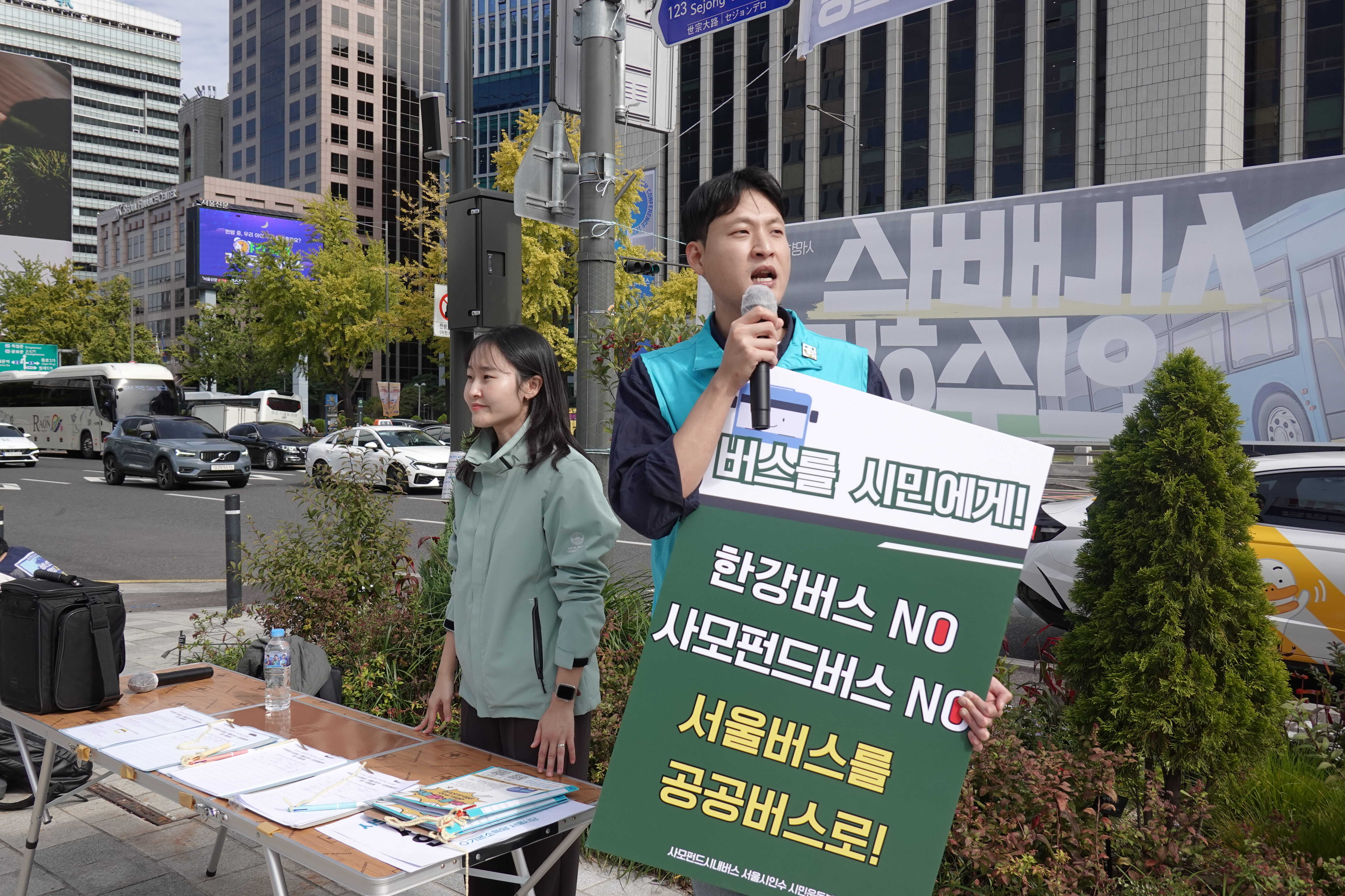 10월 24일 낮 서울시의회 앞에서 사모펀드 시내버스회사 서울시 인수를 촉구하는 "버스를 시민에게!" 선전전에 함께했습니다.