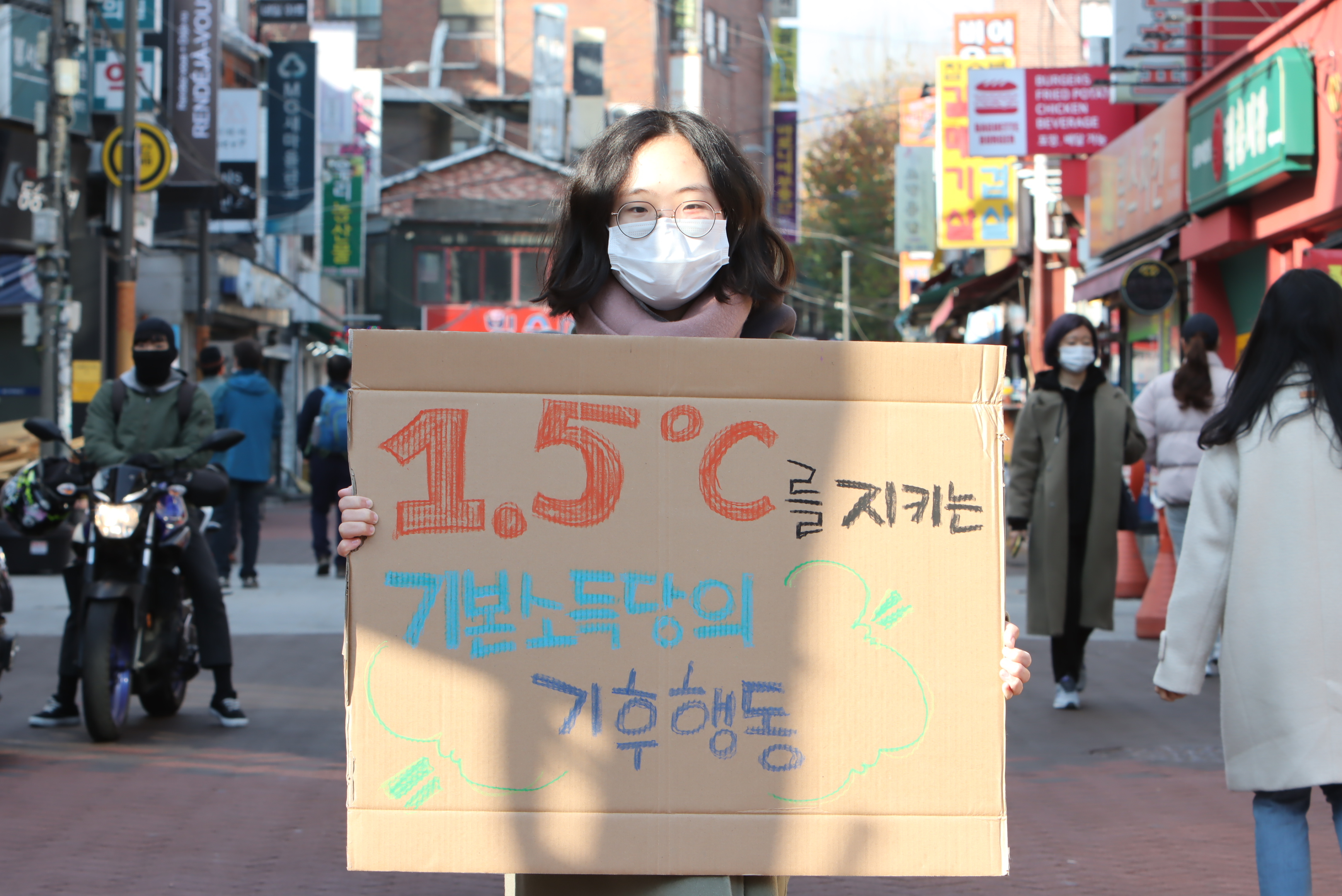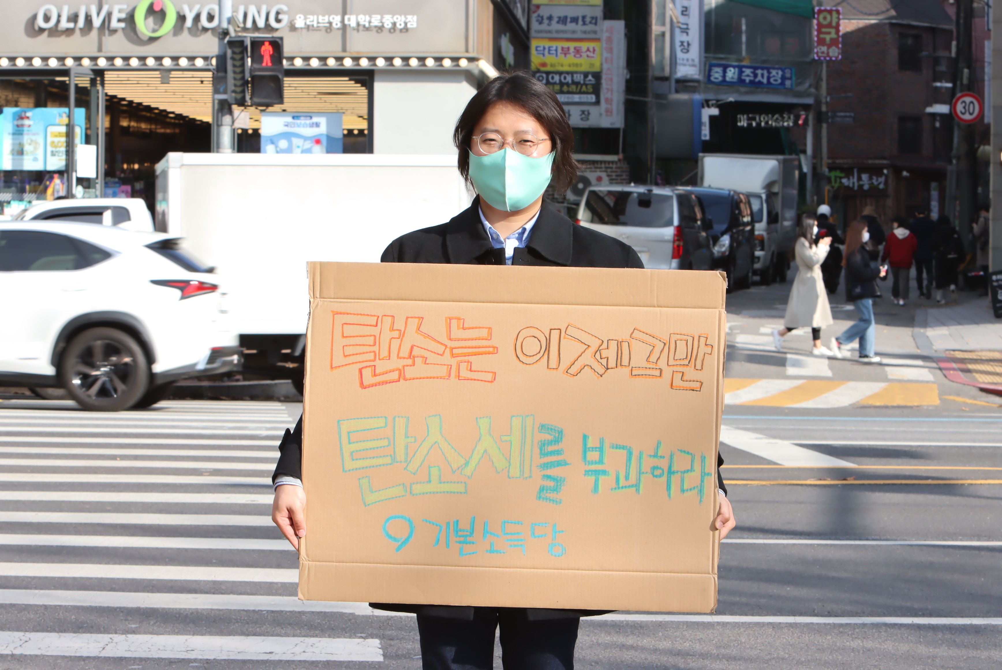 지난 21일 기본소득당도 동네방네 기후행동에 함께했어요! 당원들이 직접 크레파스로 기본소득당의 기후위기 대안을 가득 채운 피켓을 들고 대학로에 섰습니다. 그건 바로 탄소배출량을 줄이기 위해 탄소배출량만큼 탄소세 걷어 기본소득으로 나누기!
