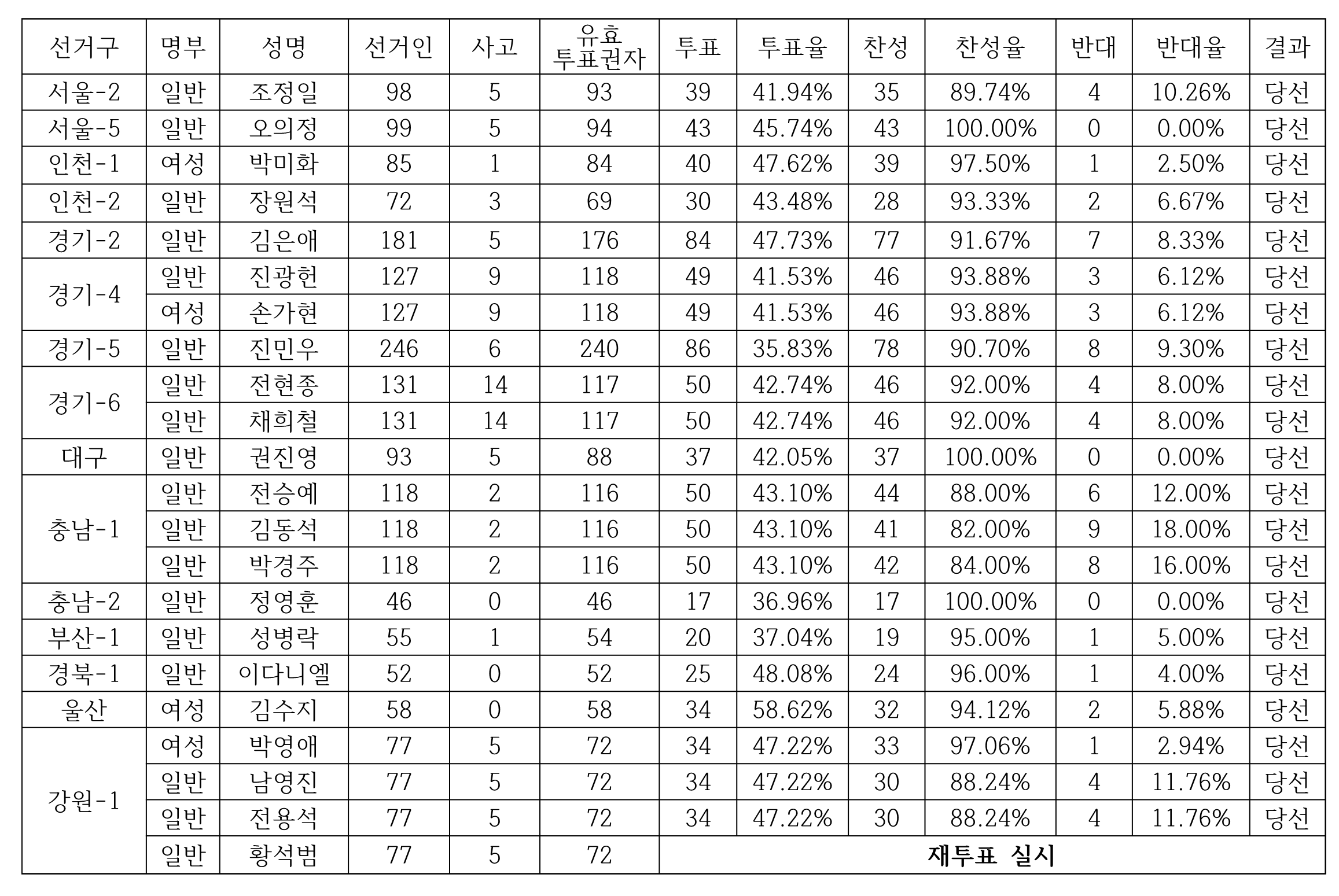 * 강원 1선거구 일반명부 황석범 후보자는 온라인투표 시스템 선거인명부 소속 누락으로 인해 재투표를 실시하게 되었습니다. 자세한 내용은 재투표 실시 공고를 확인해주시기 바랍니다.