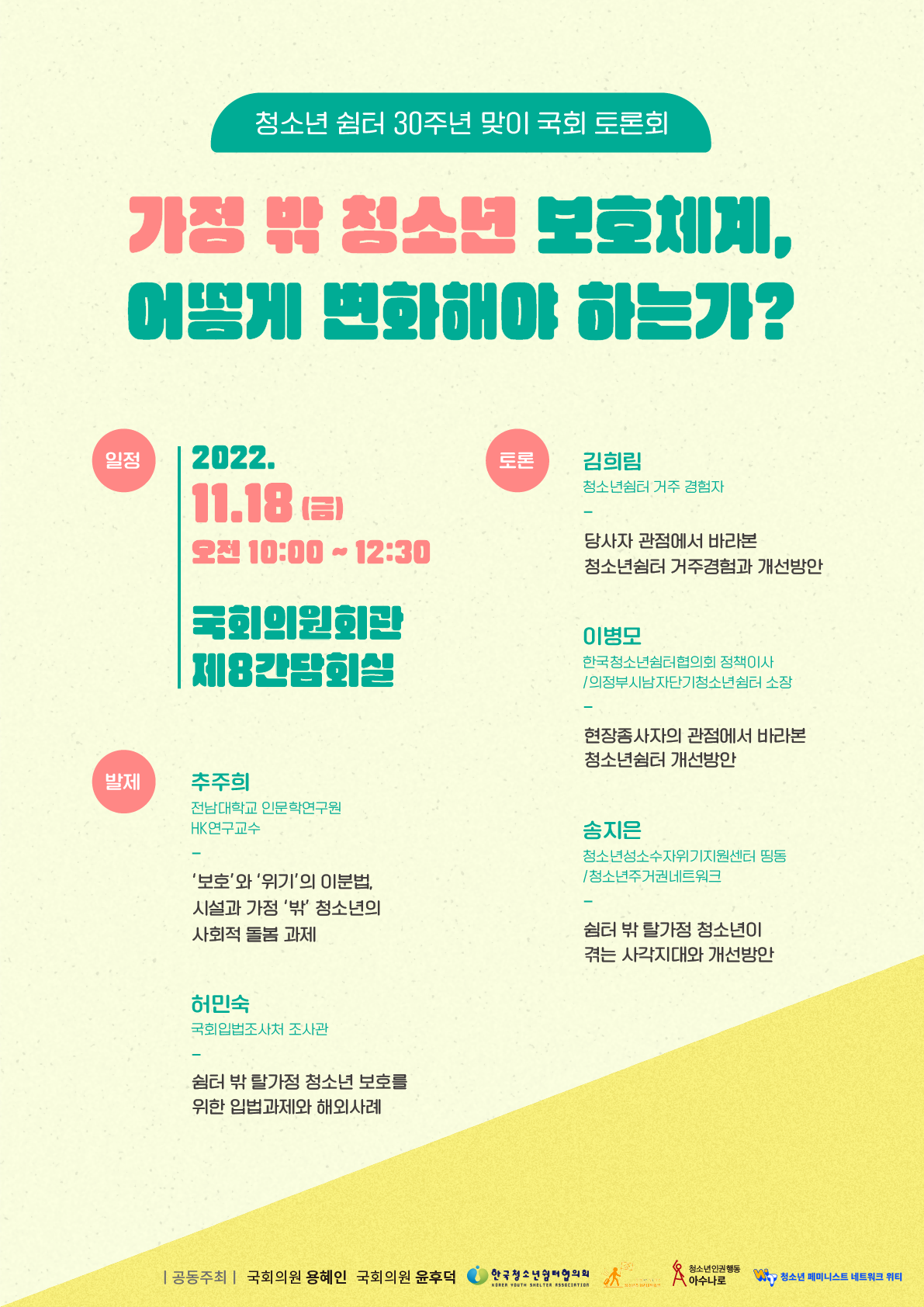- 공동주최: 국회의원 용혜인, 국회의원 윤후덕, 청소년쉼터협의회,