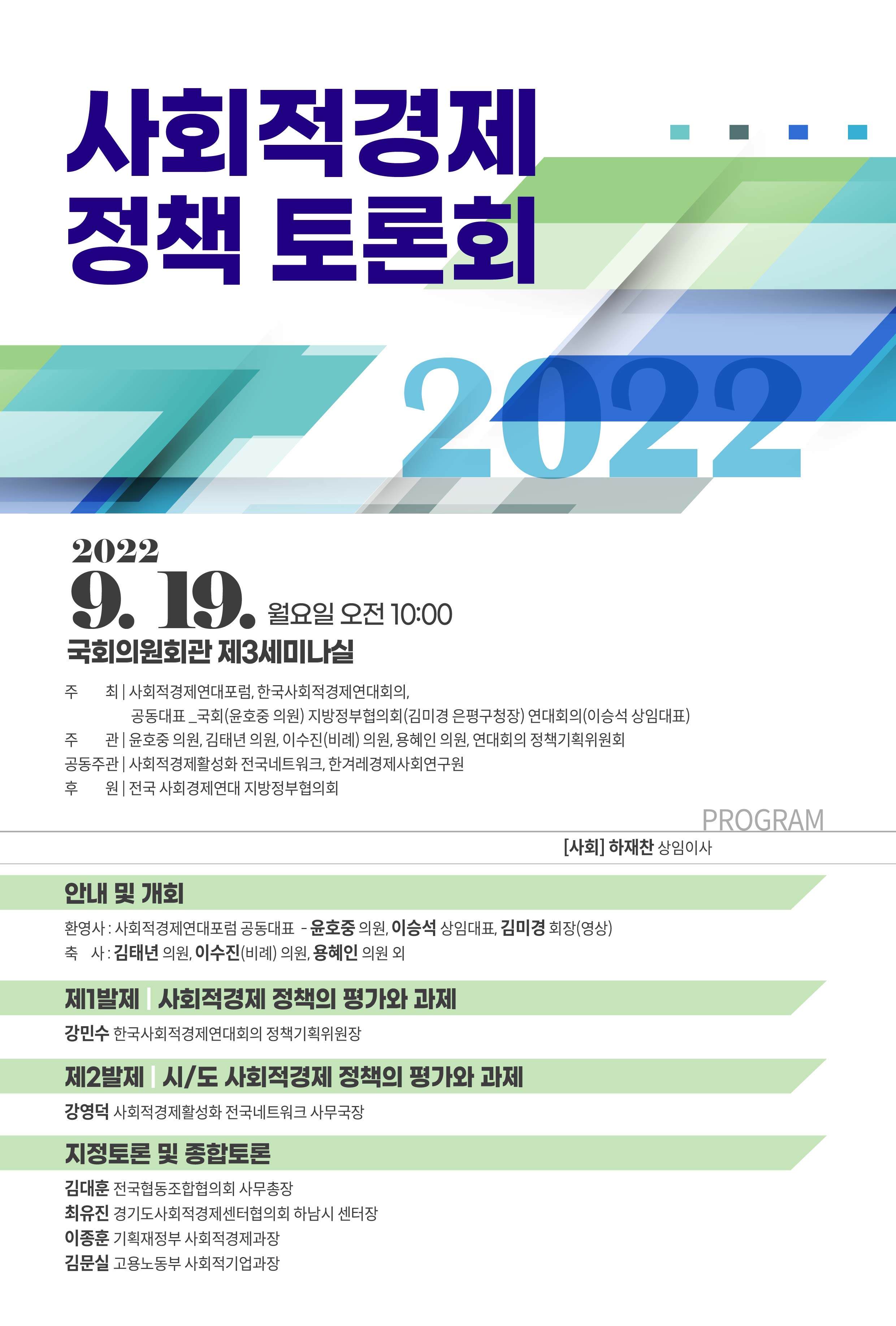 [토론회] 2022 사회적경제 정책토론회 페이지 정보 작성자 : 대변인실 작성일 : 2022.12.12. 15:21 게시판 리스트 옵션 수정 삭제 첨부파일 첨부파일 2022_사회적경제_정책토론회-자료집_최종.pdf (1.7M) 본문 이전글성평등 단협 체결과 고용과정의 성평등 확대를 위한 정책 토론회 다음글[토론회] 론스타 사태 진실, 무엇을 밝혀야 하나 목록