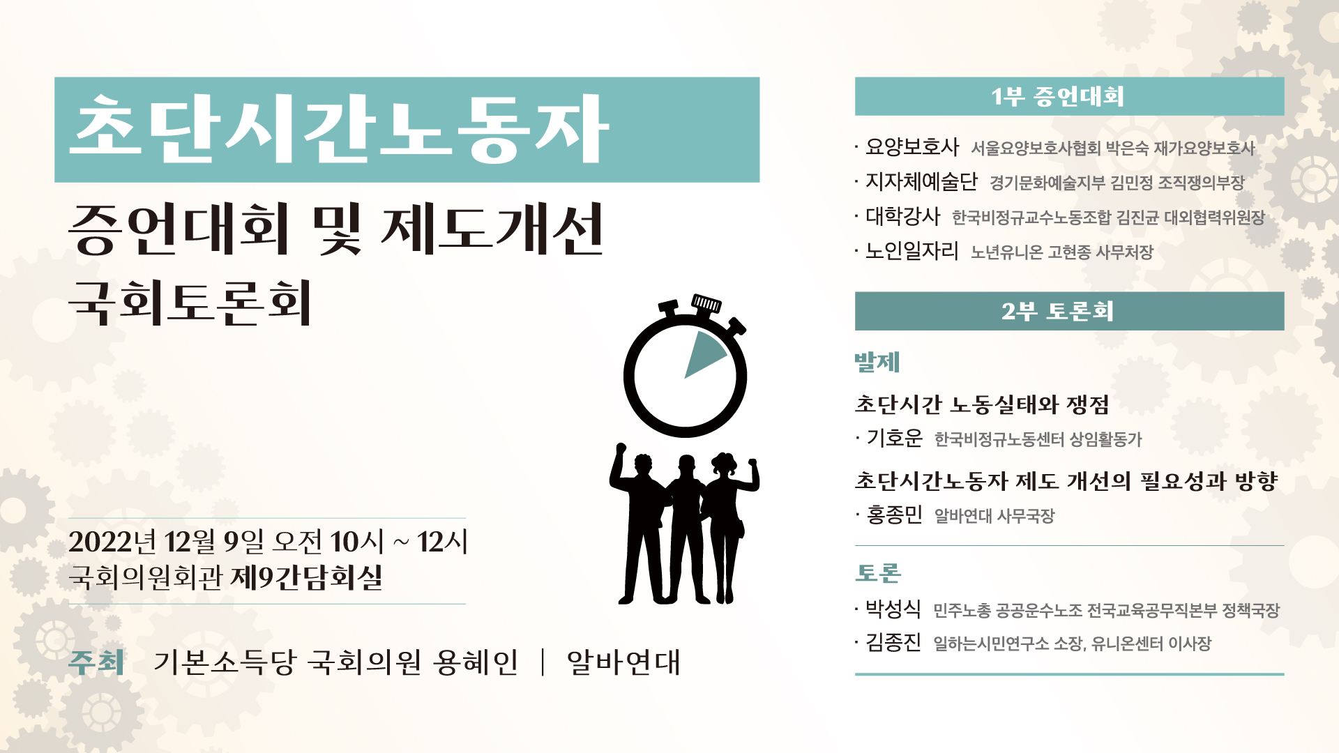 초단시간노동자 증언대회 및 제도개선 국회토론회 페이지 정보 작성자 : 대변인실 작성일 : 2022.12.12. 18:03 게시판 리스트 옵션 수정 삭제 첨부파일 첨부파일 221209_초단시간노동자-토론회-자료집-최종.pdf (7.3M) 본문 이전글[간담회] 스페인 카탈루냐주 보편적 기본소득 시범사업 목표와 전망 다음글지방 인권행정퇴행 국회토론회 목록