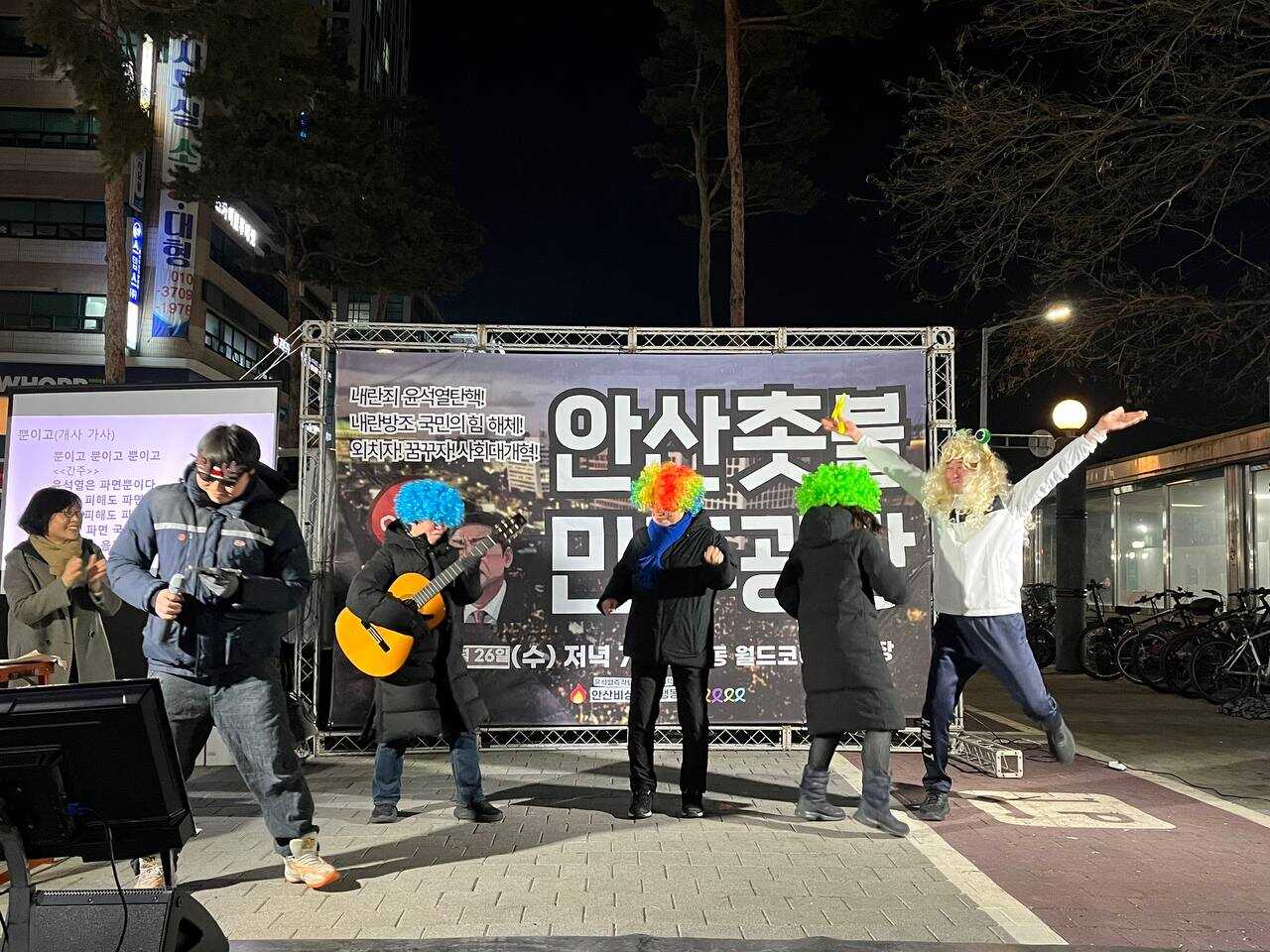 지난 2월 26일 수요일, 중앙동 동서코아 앞에서 안산촛불 민주광장이 열렸는데요! 이 날은 특별히 <노래자랑> 무대들이 마련되었어요~ 윤석열 탄핵을 외치는 다양한 시민들이 노래, 춤, 시낭송 등 장기를 마음껏 펼치는 시간이었답니다.