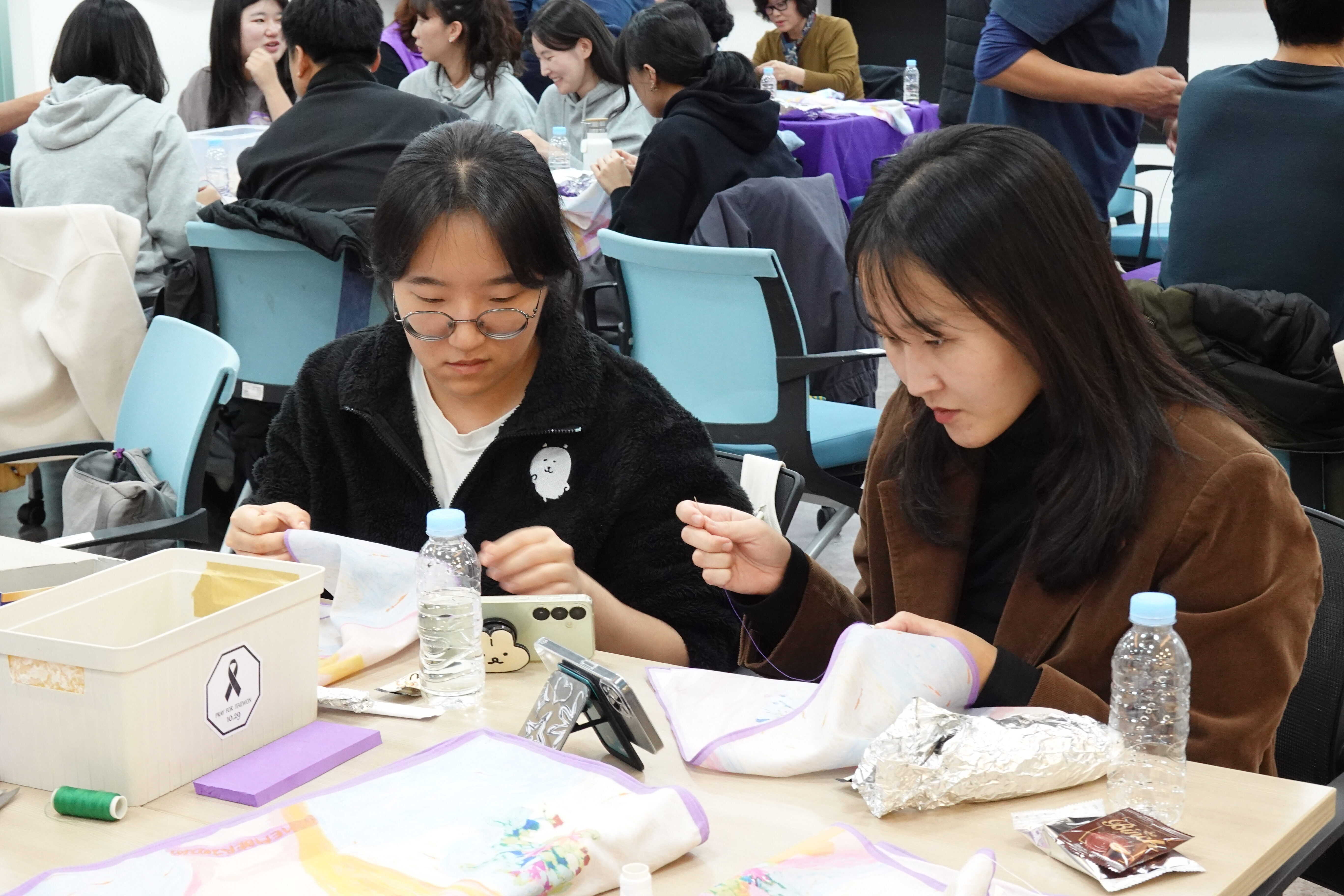 보라리본과 팔찌, 별목걸이에 이어 손수건에 보라별 로고를 뜨는 작업을 함께하고 돌아왔습니다. 가족 분들이 점점 많은 청년들이 와주어 고맙다며 반겨주셨고, 물품 만드는 법도 상세히 알려주셨어요. 직접 폴라로이드 사진도 남겨주셨답니다.