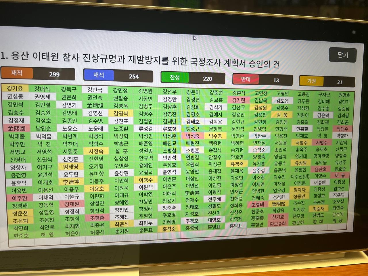 마지막으로 오늘 본회의에서 국정조사 계획서 채택 표결 결과를 공유합니다.