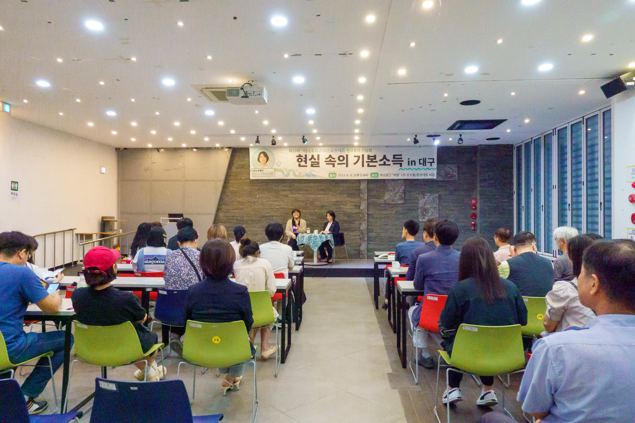 6월 9일(금) 저녁 7시 기본소득당 용혜인 국회의원은 기본소득당 신원호 대구시장 위원장과 함께 혁신공간 ‘바람’ 2층 상상홀에서 제22차 기본소득지구네트워크대회 전국투어 대구 간담회 “현실속의 기본소득 in 대구”를 개최했다.