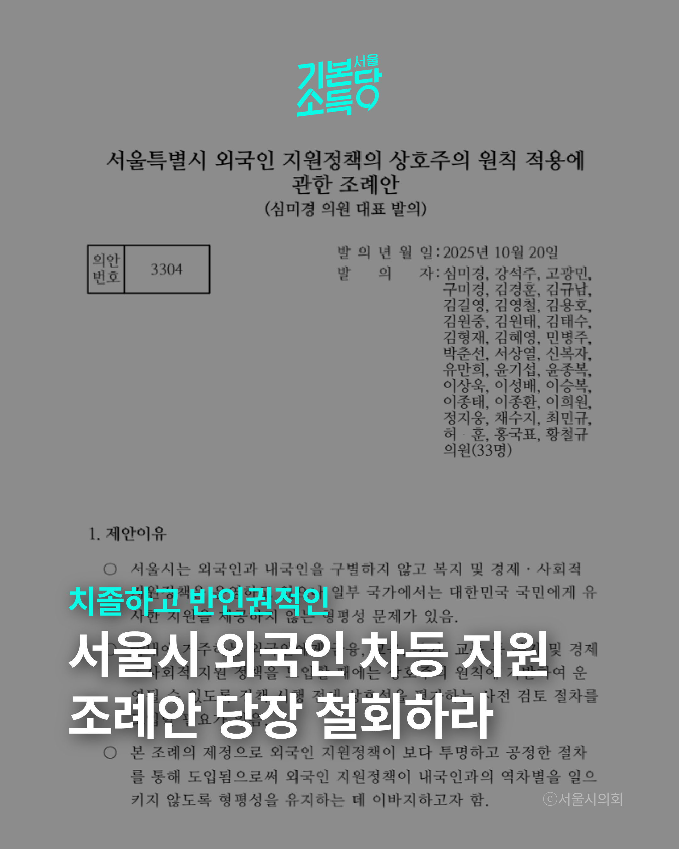 ■ 반인권적인 서울시 외국인 차등 지원 조례안, 당장 철회하라