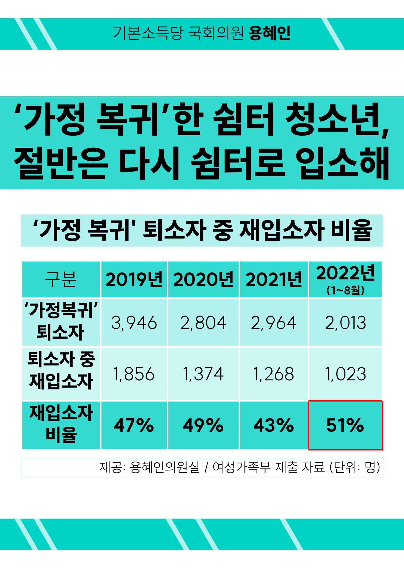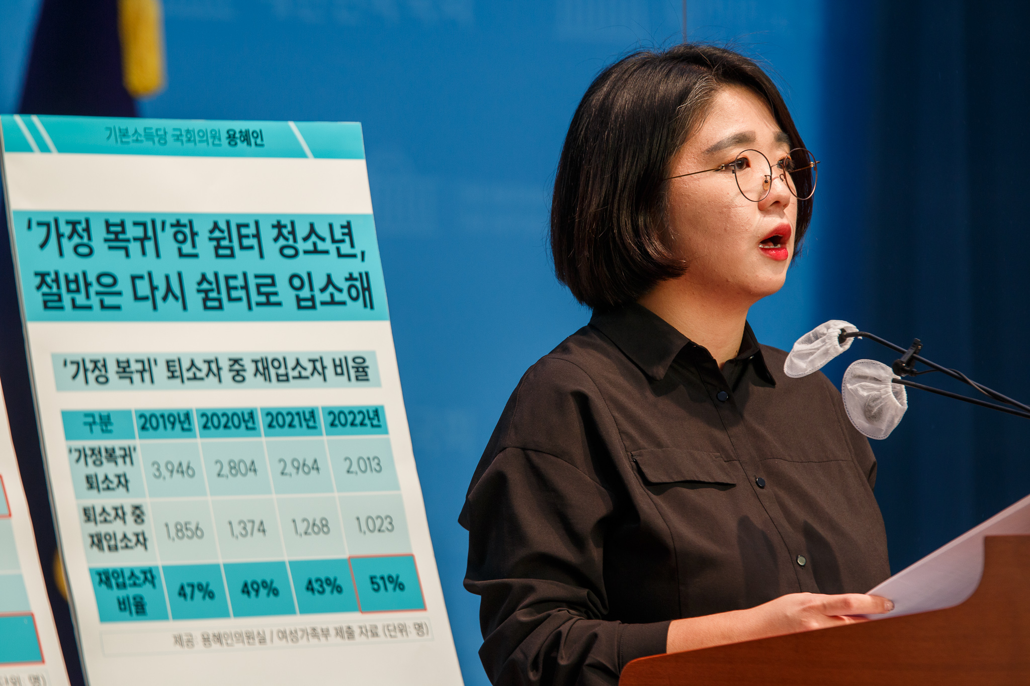 용혜인 의원은 “실무자의 자의적 판단에 의해 아동청소년의 가정 복귀가 결정되고 있다”며 “가정 회복의 정도를 면밀히 파악할 수 있는 요건 마련이 절실하다”고 말했다. 용혜인의원실이 여성가족부에 제출받은 자료에 따르면, 쉼터 퇴소 청소년 61%가 ‘가정 복귀’를 사유로 퇴소한다. 그러나 ‘가정 복귀’를 사유로 퇴소한 청소년 중 절반 이상이 쉼터 재입소를 결정해, 가정 복귀 결정 요건과 복귀 이후의 모니터링이 미흡하다는 지적이 나온다.