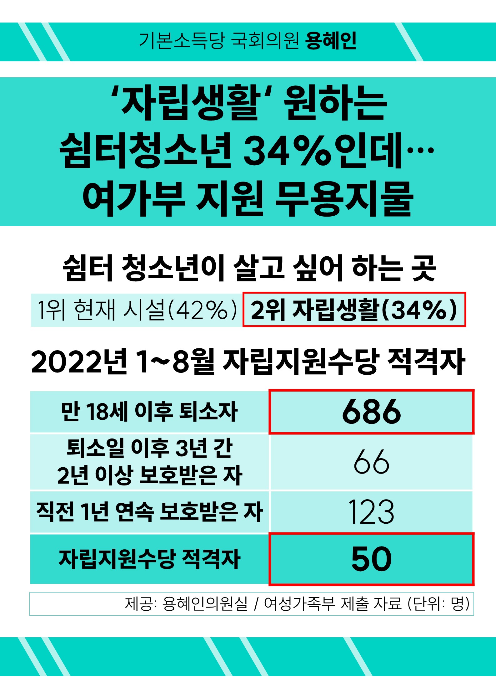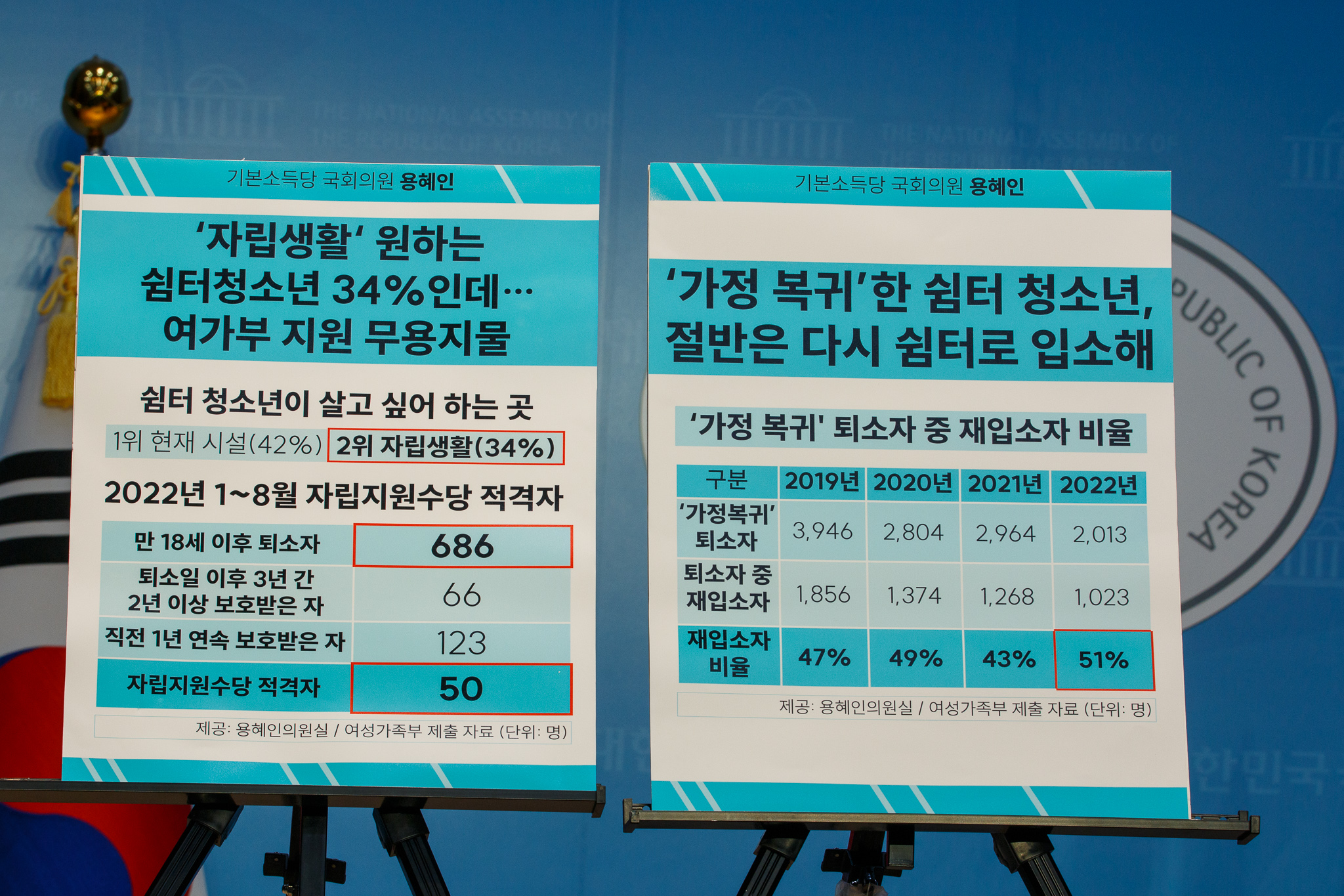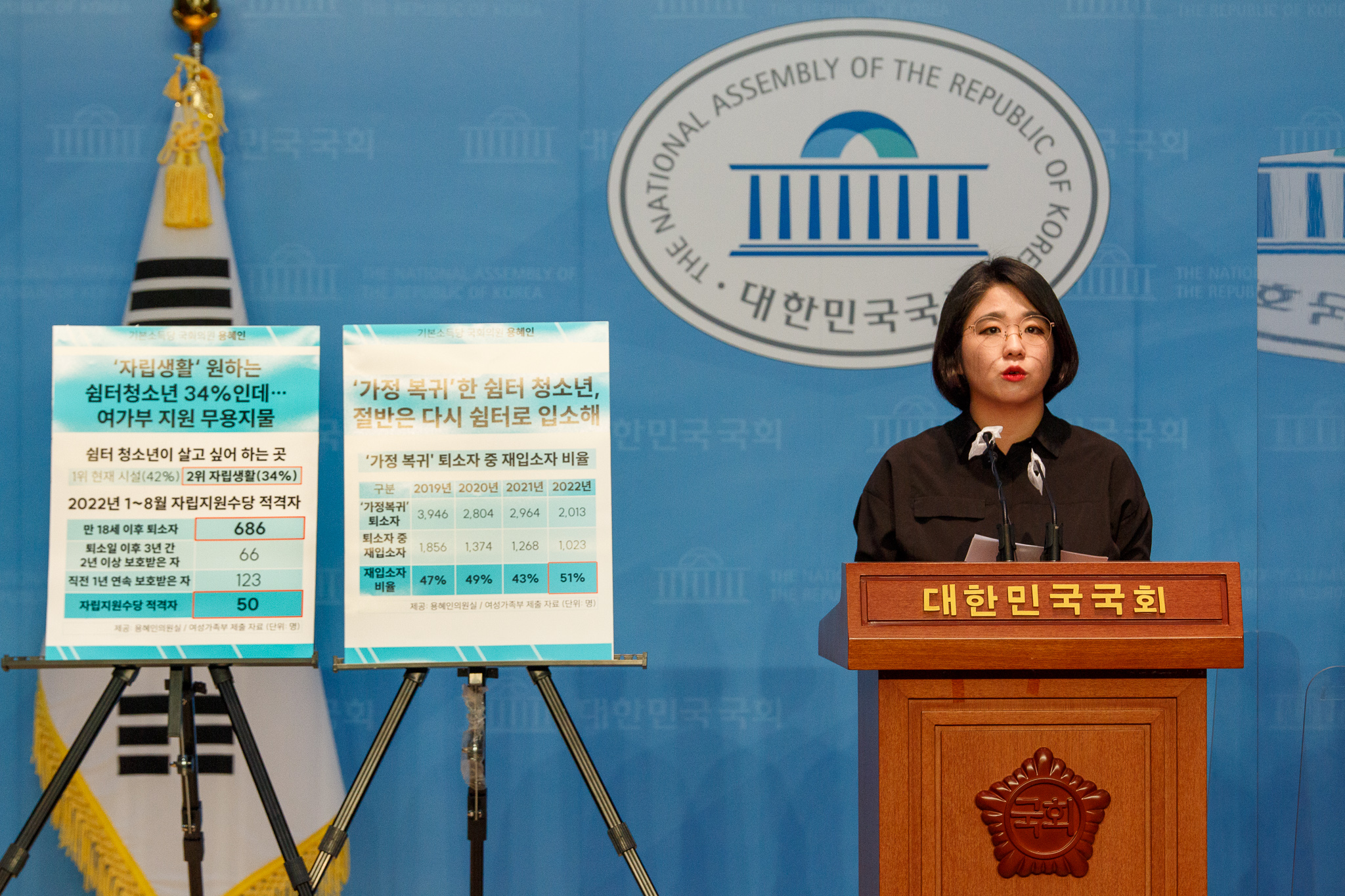 이어서 용혜인 의원은 “자립지원 역시 필요하다”고 강조했다. 용혜인의원실이 여성가족부에 제출받은 자료에 따르면, 2022년 9월 기준 쉼터 거주 청소년의 34%가 자립생활을 희망했다. 그러나 여성가족부의 자립지원정책은 대부분 만 18세 이후 퇴소자만을 대상으로 하고 있어 아동청소년기의 자립을 지원할 수 없다. 또한 퇴소일 기준 과거 3년 간 2년 이상 보호받은 자 등 까다로운 요건을 가지고 있어 가정 밖 청소년이 이용하기 어렵다는 지적이 나온다.