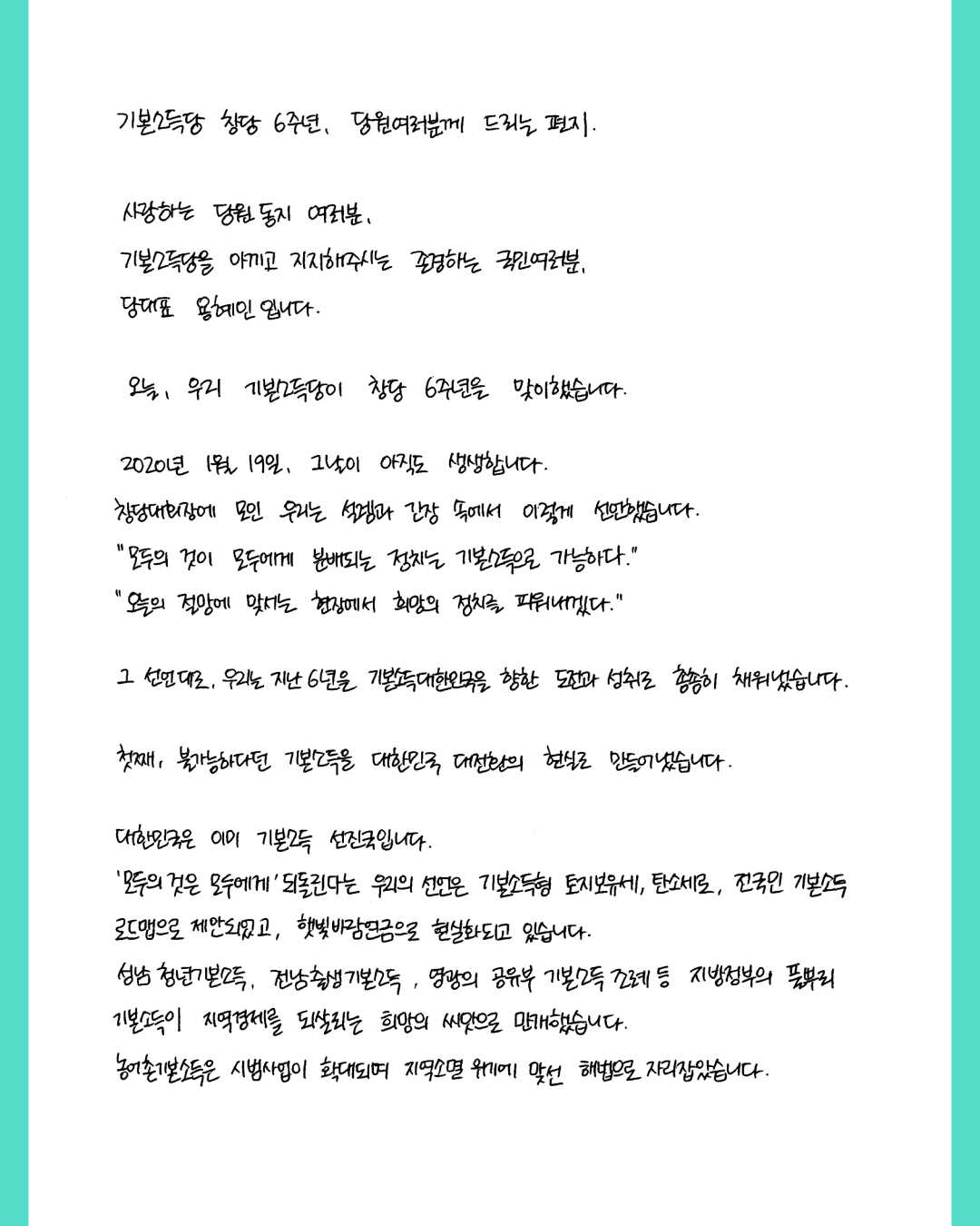 기본소득당 창당 6주년, 당원 여러분께 드리는 편지