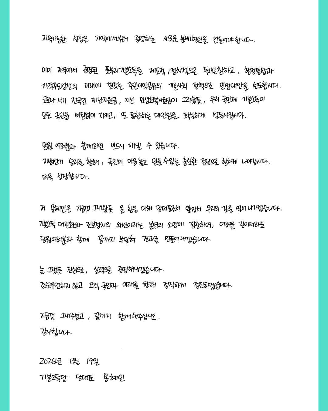 이미 지역에서 증명된 풀뿌리 기본소득을 제도적으로 정치적으로 뒷받침하고, 행정통합과 지역주도성장의 미래에 걸맞는 주민 이익 공유의 기본사회 정책으로 민생대안을 선도합시다.